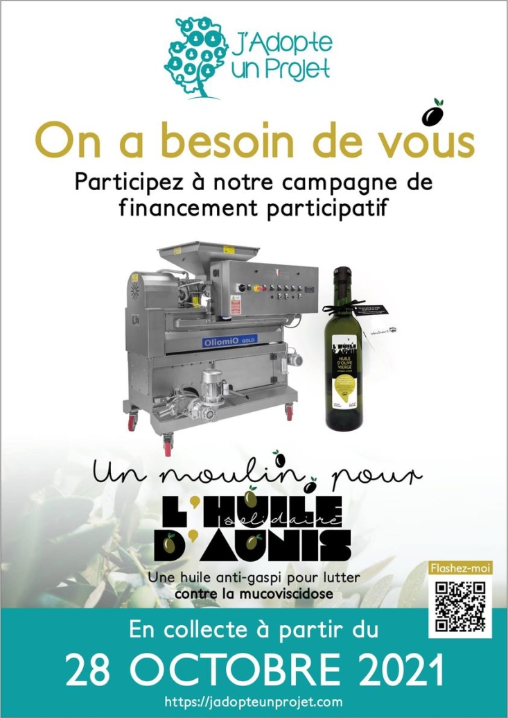 Le financement permettra à l'association de s'équiper d'un moulin afin d'augmenter les quantités d'olives collectées pour produire une huile de qualité gastronomique dont les bénéfices des ventes sont reversés à la recherche contre la mucoviscidose.