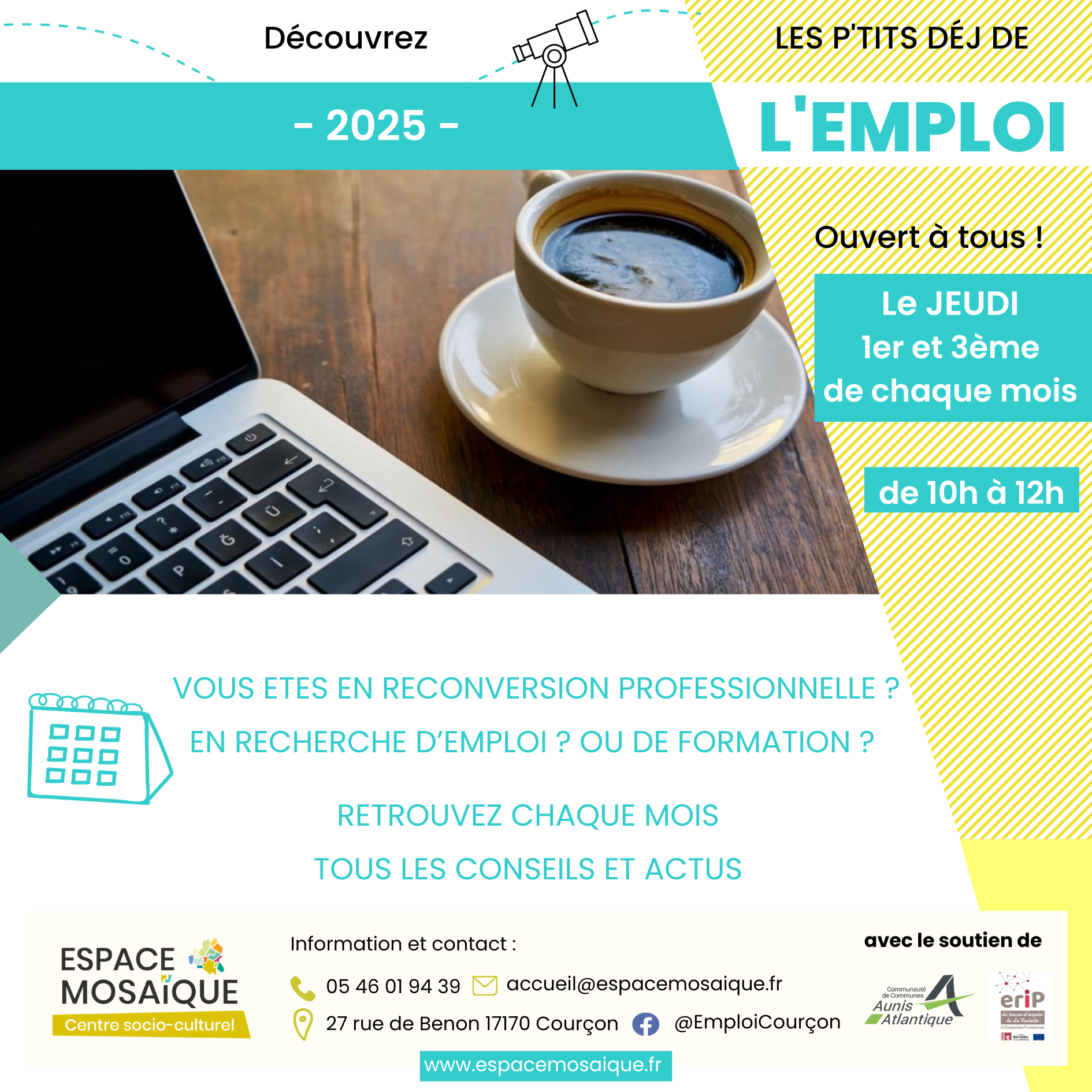 Rejoignez l'espace mosaïque chaque 1er et 3ᵉ jeudi du mois pour un rendez-vous dédié à votre avenir professionnel !